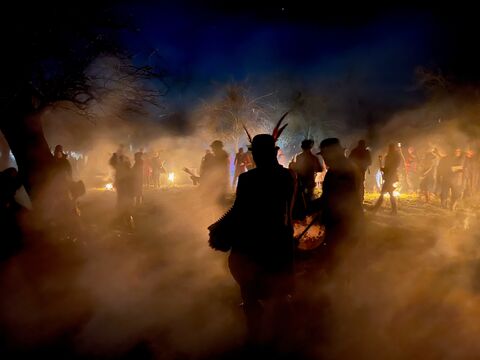 A tree in the foreground with a crowd behind holding candles/torches - it's nighttime