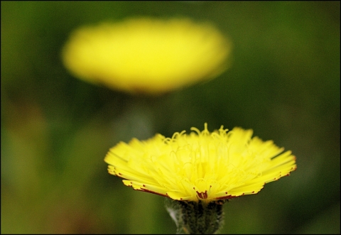 Looking a bit like a ragged version of a dandelion, mouse-ear hawkweed has lemon-yellow flower heads that are tinged with red at their outer edges. It likes grassy places with short turf and chalky soils.